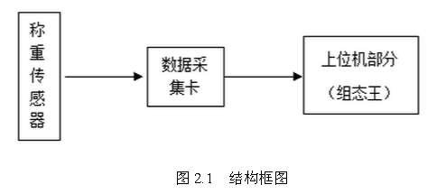 系統(tǒng)由三個部分組成:稱重傳感器,數(shù)據(jù)采集卡以及上位機(jī)部分,系統(tǒng)的結(jié)構(gòu)框圖如圖2.1所示: